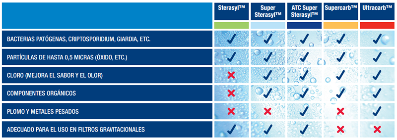 Hay 5 grados de elementos filtrantes Doulton® y British Berkefeld® disponibles: